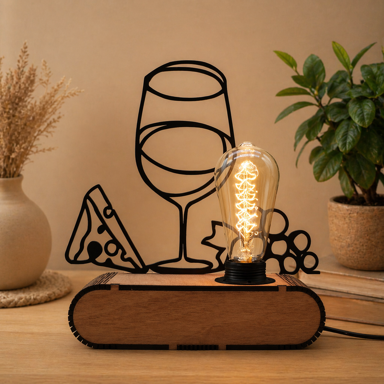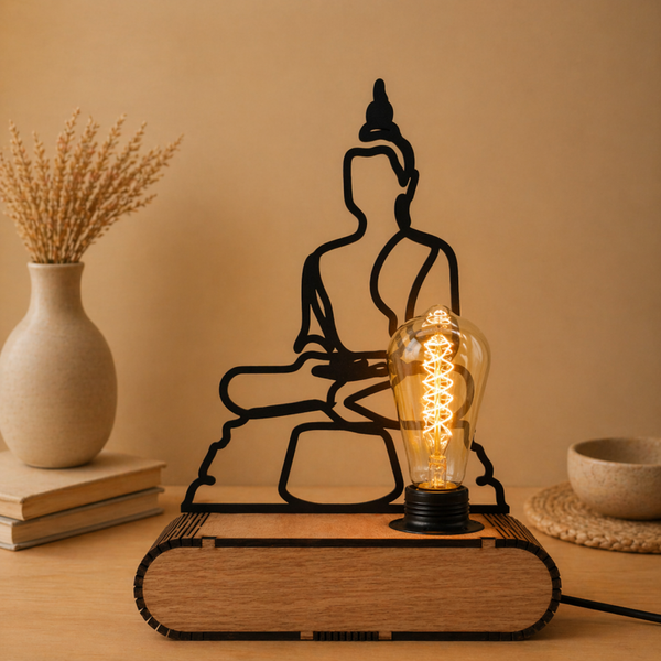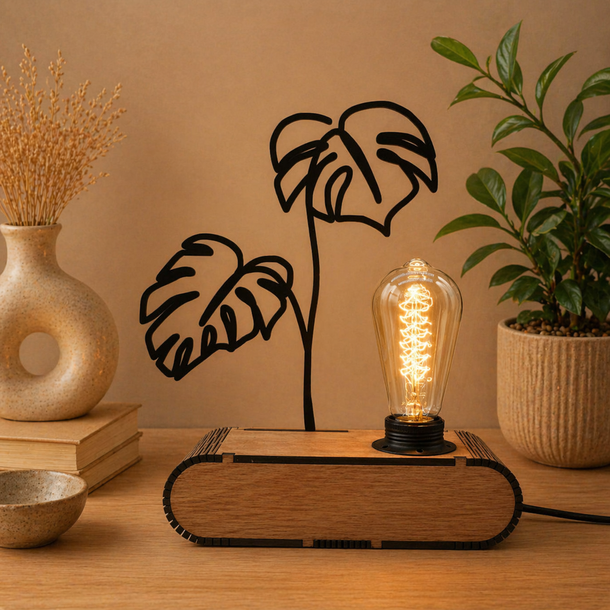 Breng direct sfeer in je interieur met deze unieke designlamp. Deze lamp is meer dan alleen verlichting – het is een echte blikvanger. De combinatie van warm licht, een stijlvolle houten basis en een strak zwart silhouet maakt dit een modern kunstobject dat perfect past in elk interieur.